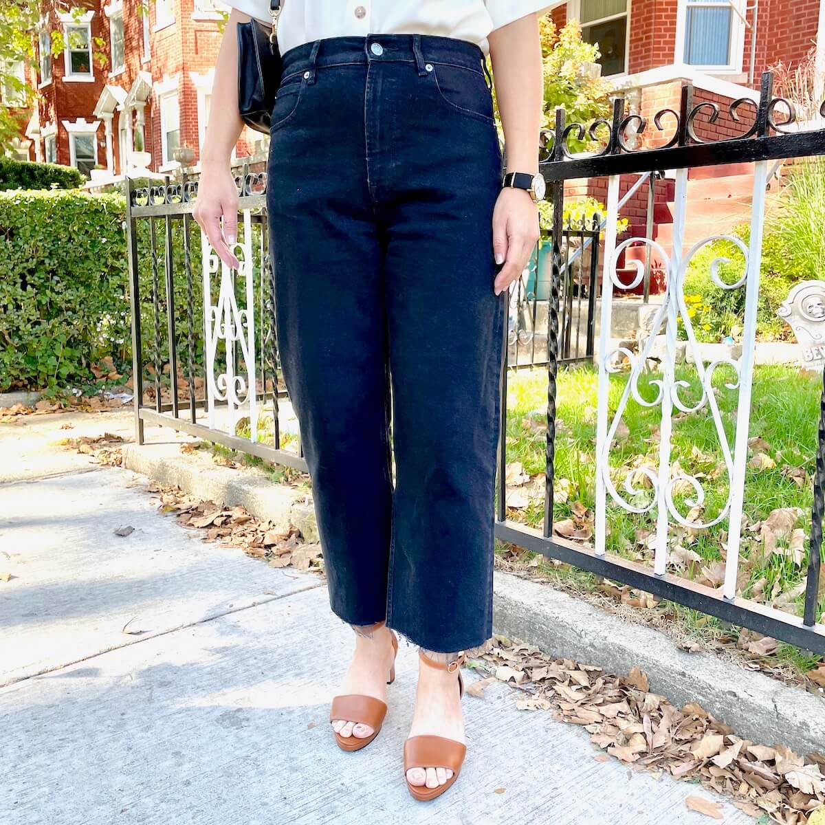 Ooops, doing that pigeon toe thing, a bad habit from childhood. Wearing: Everlane Way-High Jean // Vetta Shirt // dr. Liza Sandals // Lo & Sons Bag [review]