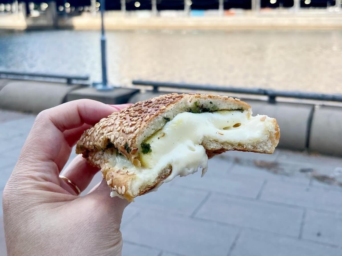 We tried the Jerusalem bagel sandwich with egg and cooper sharp cheese. Texture-wise, the crisp, thin bagel contrasts nicely with the melty, gooey cheese and egg on the interior.